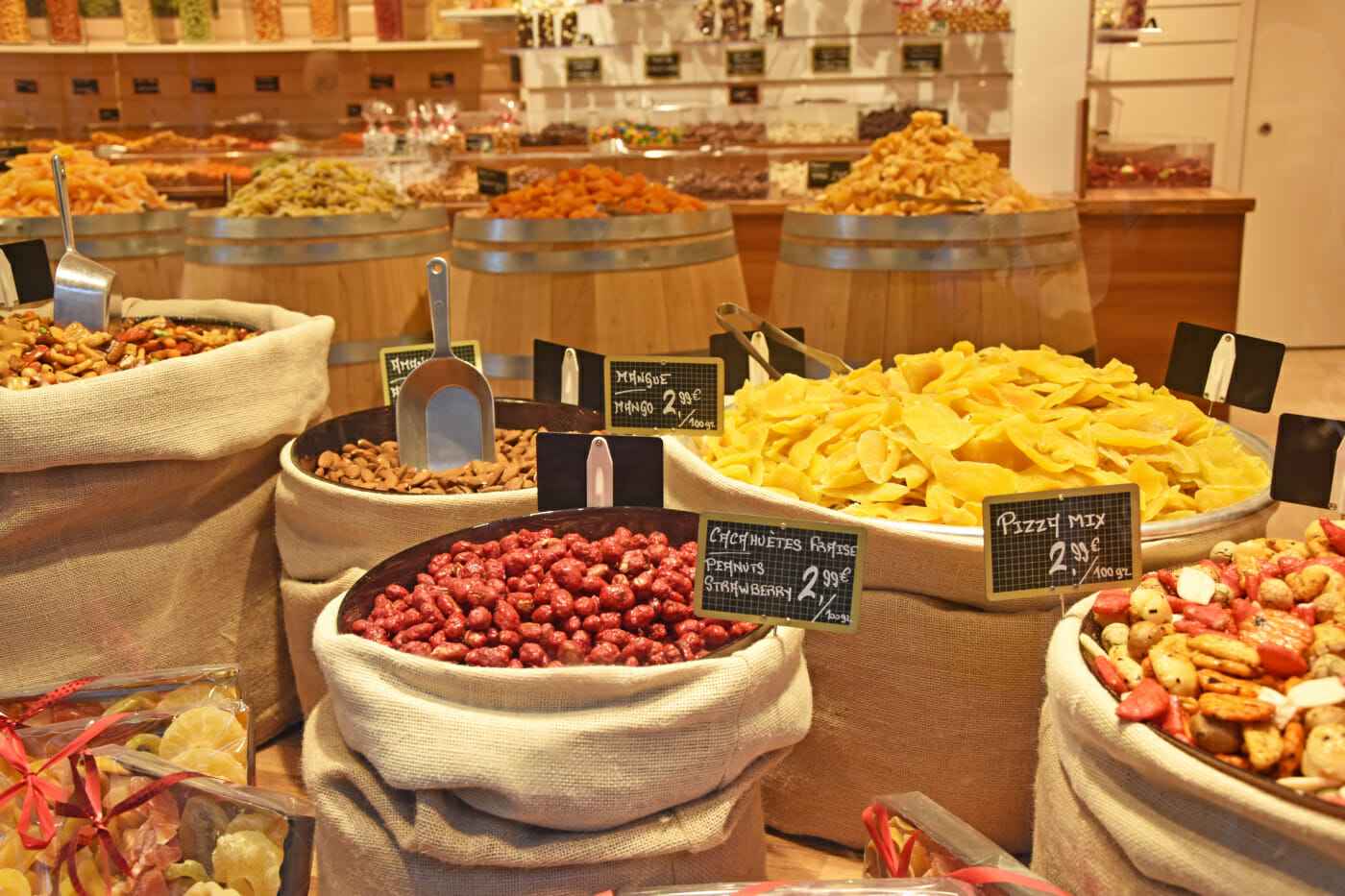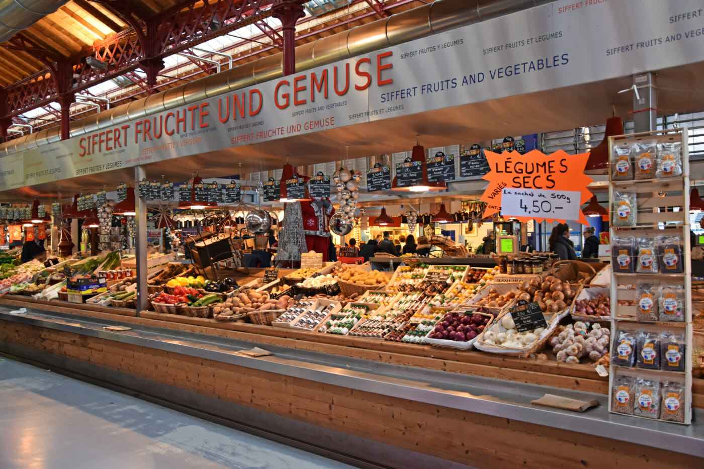 Culinary, there is much to discover in Colmar. On the streets you can not miss a French crepe under any circumstances. But also churros stands are obviously very popular here. Since I went to Colmar on the weekend of the Epiphany, there was a galette de rois. If you like dried fruits as much as I do you’ll be happy. In the town are several shops where you can buy any conceivable fruit, nut or candy. There is also a market hall in the fishing district. Furthermore, there is a market in front of the market hall.