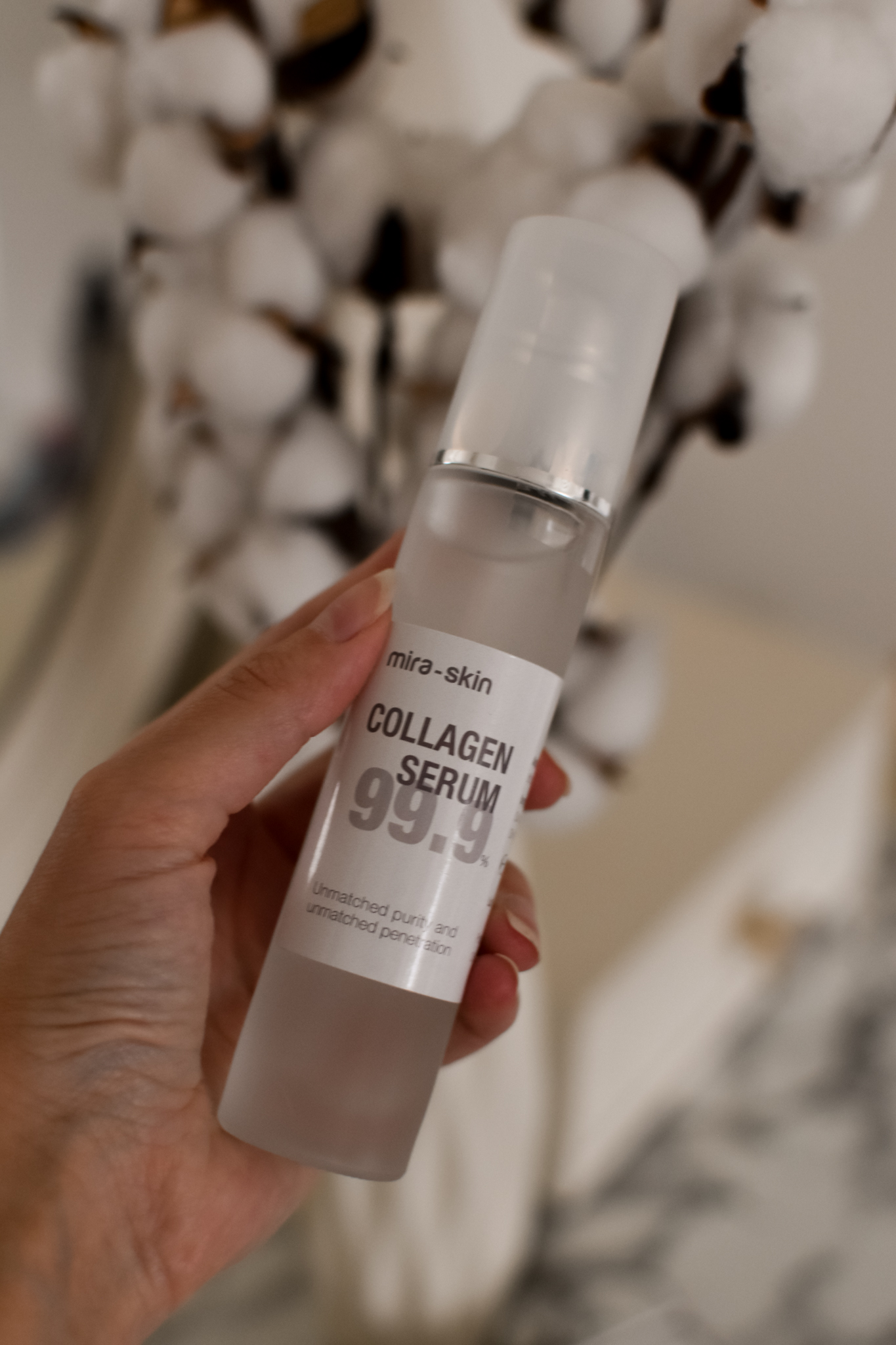 Before the treatment it is important to clean the skin thoroughly, this is important to neutralize the pH value of the skin and to remove any residues on the skin. I use a mild washing lotion for this purpose. As the 1st step of the treatment, I then apply the serum to the skin and let it take effect. Mira-Skin hyaluron serum is different penetrates deep into the skin due to its structure (short-chain molecules). It contains collagen, microcrystalline silver, MSM, vitamin E, omega 3, vitamin A and CoQ10. Due to the high concentration of hyaluronic molecules, it can also bind significantly more water molecules (moisture) in the skin and plumps up better than other products. The serum is absorbed within a short time. By the way, it can be integrated not only before the treatment, but also otherwise in the care routine both in the morning and in the evening. Mira-Skin now also offers Collagen Serum with 99.9% collagen. This effective serum is applied to the skin once a day. I particularly like to use it after treatment with the Mira-Skin ultrasound device, as this significantly increases the skin’s ability to absorb collagen.