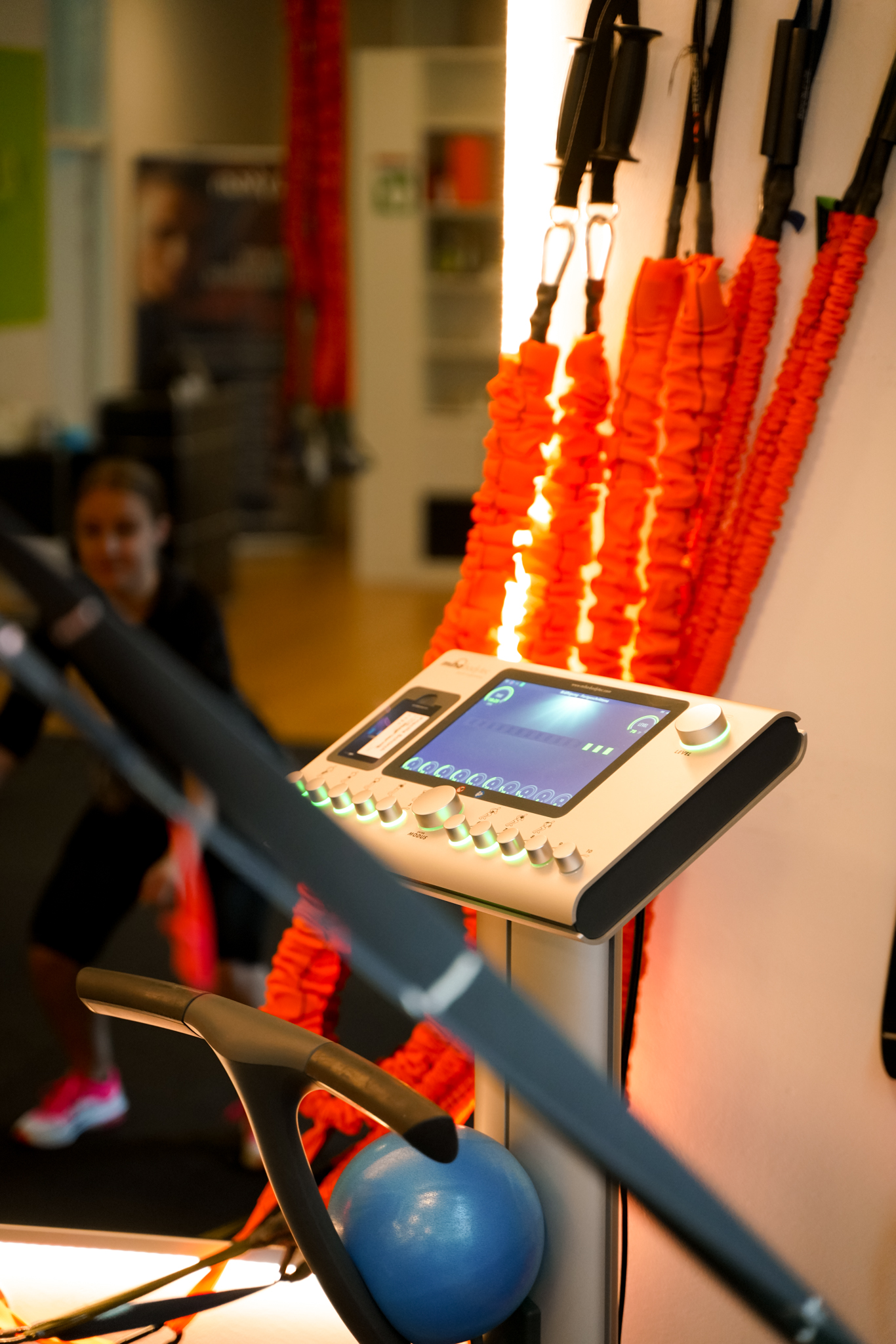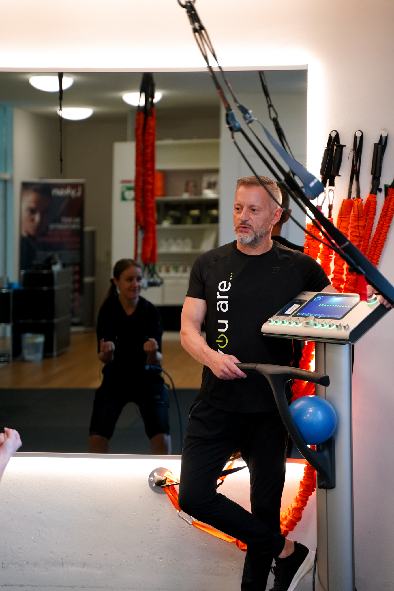 In der Ausgangsposition lässt sich der Strom anpassen. Zugegebenermassen war das erste Training unter Strom etwas gänzlich Neues. Die Trainer – wie hier Roger Appert – können die Intensität aufgrund ihrer Erfahrung super einschätzen. Habe ich doch manchmal dazu geneigt etwas früher Stop zu sagen als nötig. Während dem Training wird die Intensität zudem laufend angepasst. Der Strom kann für die einzelnen Körperbereiche gezielt eingestellt werden, damit wird auf die unterschiedliche Leistungsfähigkeit der entsprechenden Muskelgruppen eingegangen.