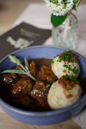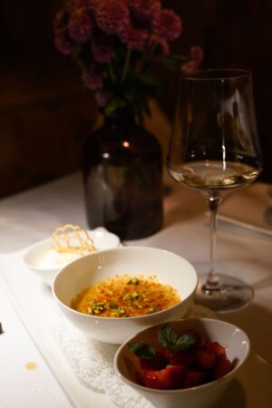 Das Menü begann mit hausgemachtem Brot und Butter, gefolgt von einer Auswahl an Antipasti auf der Fassdaube. Als Hauptgang wurden hausgemachte Bärlauch-Tagliolini mit Terlaner Spargeln serviert, gefolgt von Rote Bete-Röllchen in der Consommé. Der Höhepunkt des Abends waren die Südtiroler Kalbsfiletmedaillons an Lagrein Sauce, begleitet von Kartoffeln und Brokoli sowie das Minze-Halbgefrorenes an Erdbeer-Knödel. Dieses köstliche Menü vereint die Aromen der alpin-mediterranen Küche mit lokalem Wein und bietet ein unvergessliches kulinarisches Erlebnis.