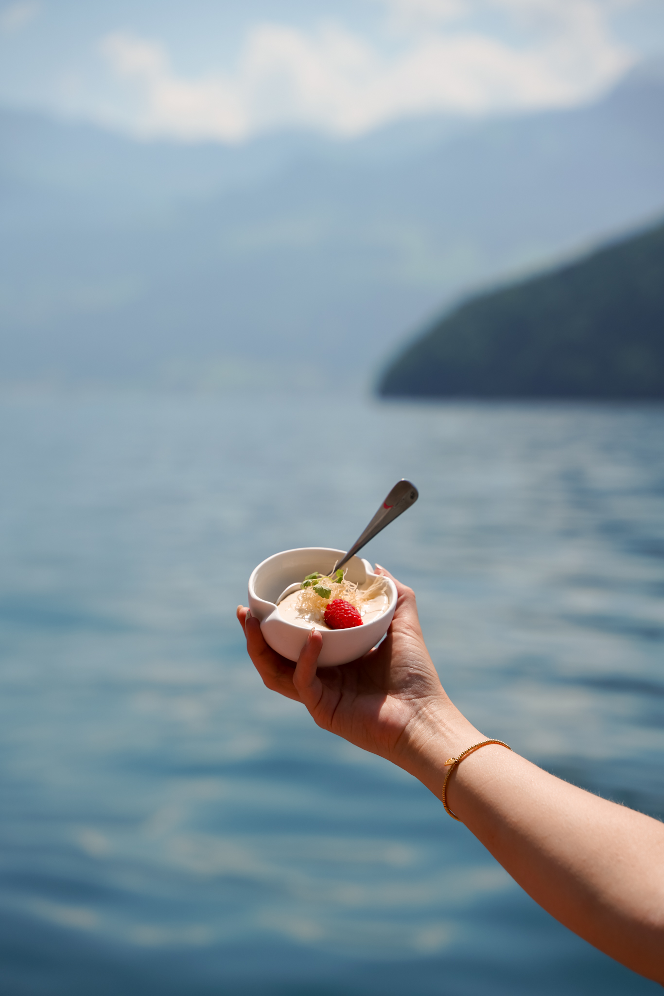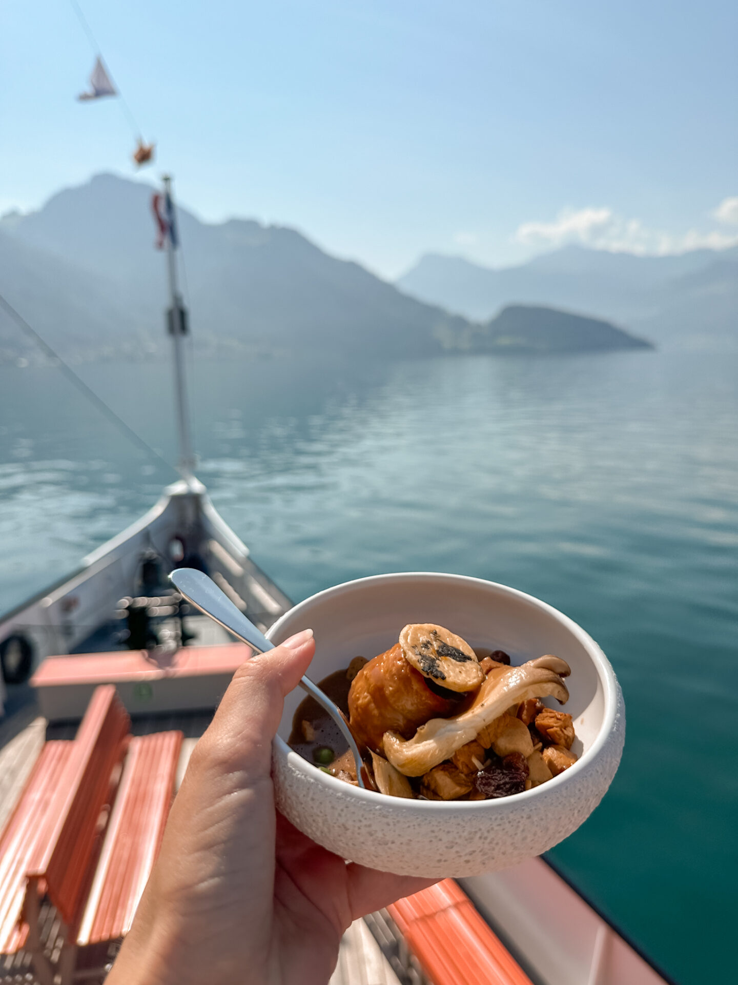 Ein echtes Highlight – im wahrsten Sinne – ist das Essen an Bord. Wer hier nur an klassische Schifffahrtsküche denkt, liegt weit daneben. Was auf dem Teller landet, ist auf Sterne-Niveau, aber mit einem wunderbar regionalen Herzschlag. Urner Alplamm mit Sbrinz und Thymianvinaigrette, zartes Luzerner Mini-Pastetli, cremiges Claridengletscher-Fondue, Zander aus den Schweizer Alpengewässern, perfekt gegartes Innerschweizer Rindsfilet mit Rösti – und zum krönenden Abschluss ein Vierwaldstättersee-Eiskaffee, der schmeckt wie ein süsser letzter Blick über den See.