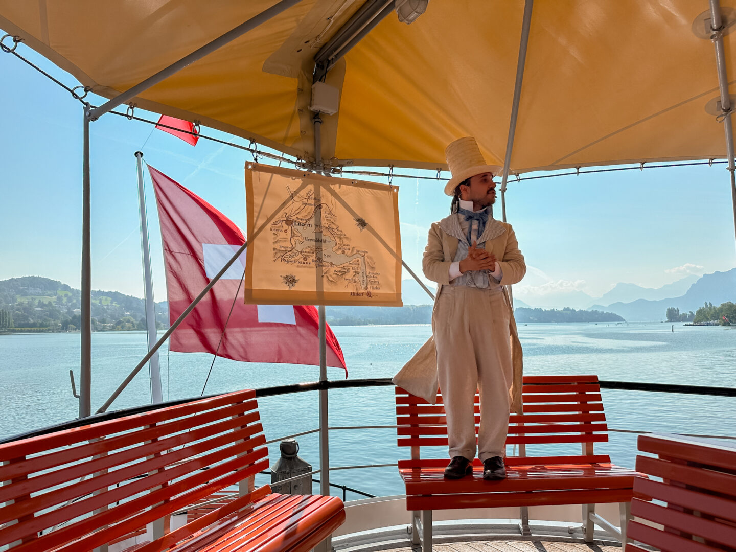 Schon beim Einstieg am Hafen von Luzern spürt man: Das hier ist kein gewöhnlicher Schiffsausflug. Eine freundliche Crew, elegante Details und ein Hauch von Theater begrüssen die Gäste. Und dann tritt er auf: Casimir Friedrich Knörr – Kaufmann, Bankier, Visionär, in Gestalt eines charismatischen Gastgebers.