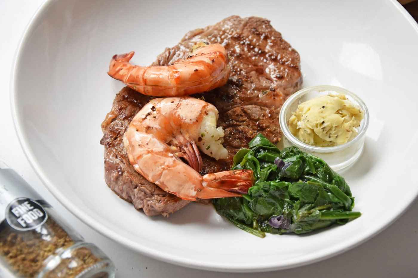 - Das Steak zusammen mit den Garnelen, dem Blattspinat und der Knoblauch-Gewürzbutter servieren. Dazu passt Brot oder Reis.