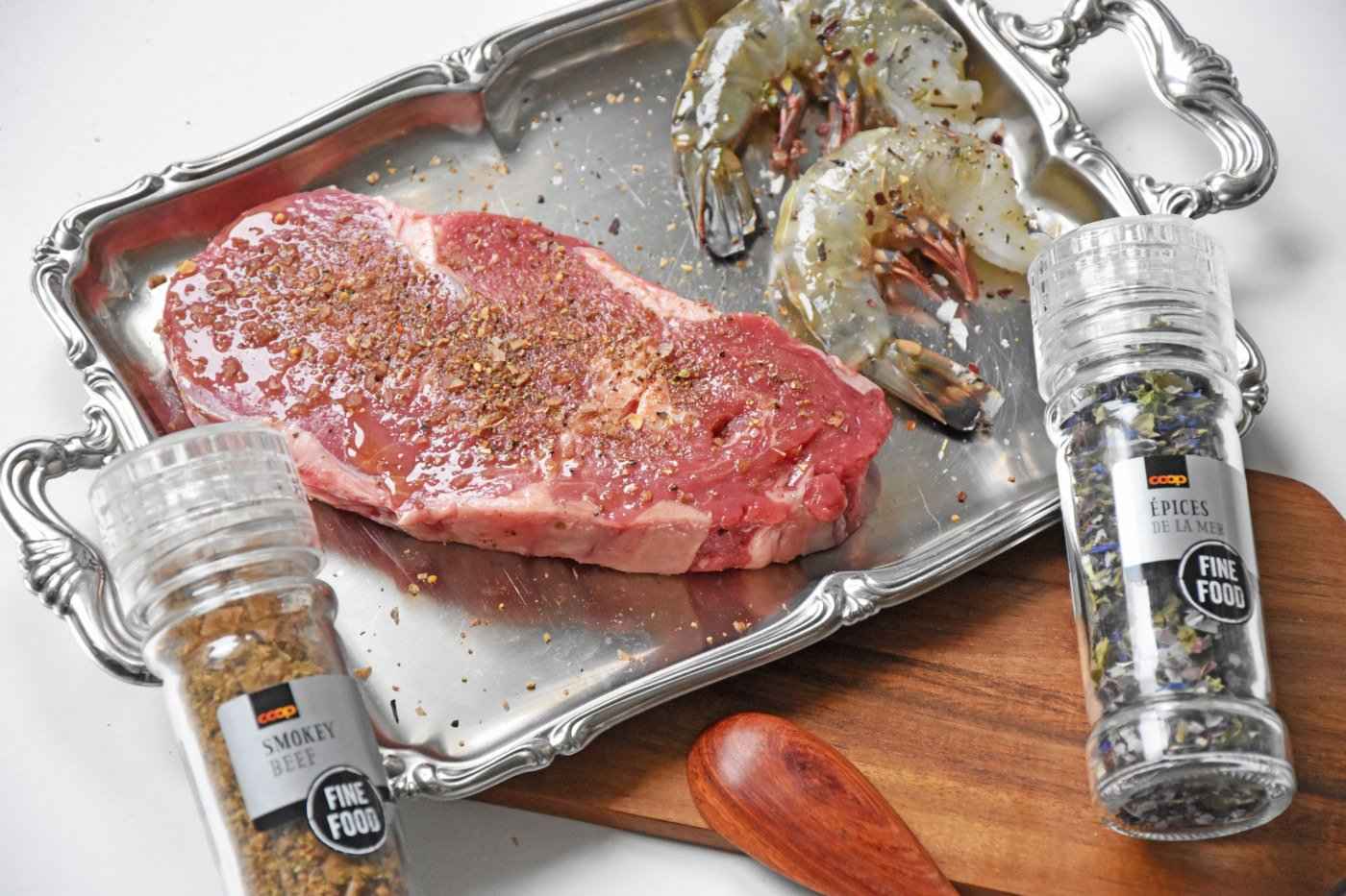 - Das Rindshohrückensteak mit Olivenöl einstreichen und auf beiden Seiten mit Coop Fine Food Smokey Beef würzen. Mindestens 20 Minuten marinieren lassen.